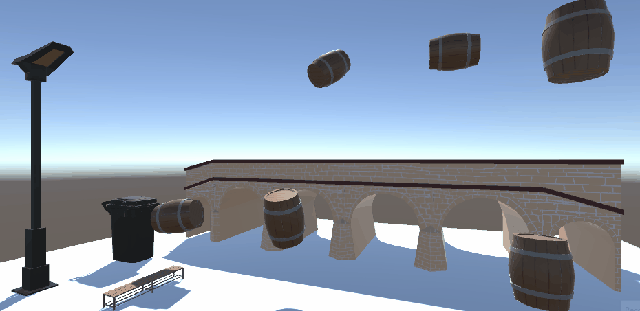 Learnt how to import models into unity this week. I imported the barrel and bridge from module 1 as well as three free models, a bench, bin and a street lamp: