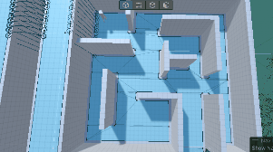 Generating a NavMesh isn't very hard to do but actually getting to be consistent was quite difficult. There are many settings to take into account and you can even allow for the mesh to calculate if an NPC can walk of an edge or jump across a gap. I played with the settings until I got something that was fairly good. You can see in the image below what the mesh looks like. The arrows indicate jumps or falls that an NPC can make and anything that is highlighted blue can be walked on.